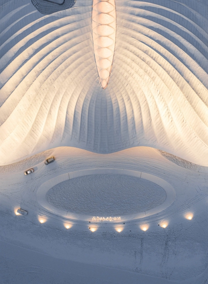 MAD工作室说:“靠着在亚布力的山地,我们的设计产生了一个帐篷坐落在山脚下的概念,其柔软,弯曲,银白色屋顶与周围积雪的山头相呼应,”