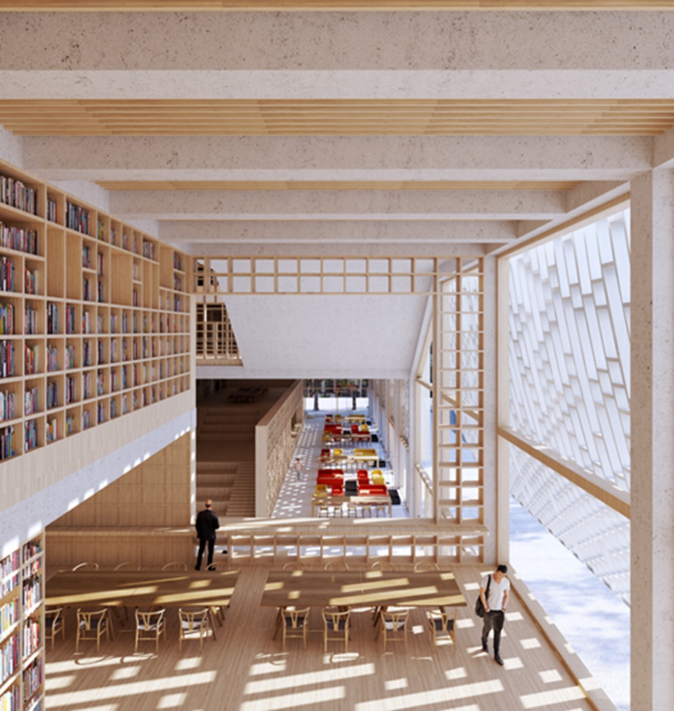 一个大中庭将打开内部,展示建筑内的不同功能和活动,而墙壁上和书柜之间的开口将提供到塔普西克广场的视野。