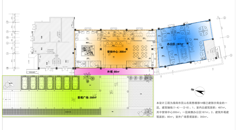 览山名苑售楼部,北仓设计,魏双览山名苑售楼部1#楼已建部分商业的一层,建筑轴线(1-A)—(2-D)。1、室内总建筑面积:487㎡,其中营销中心300㎡;一层南侧办公区187㎡;2、建筑外观建筑面积:80㎡;室外广场景观面积:350㎡。设计风格:现代轻奢。